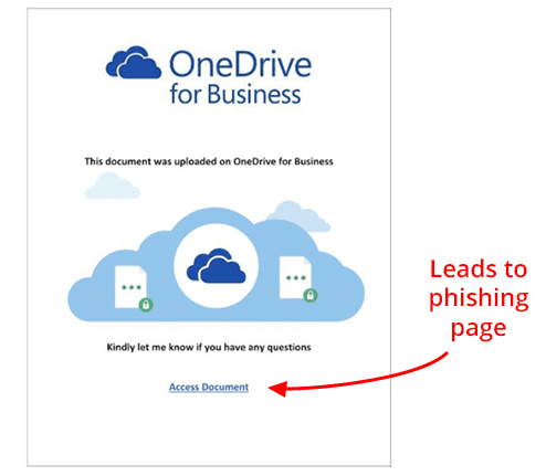 The file shared is made to look like a OneDrive file, when the user attempts to open the file they are presented with content that impersonates a standard SharePoint request to access a OneDrive file that displays an “Access Document” link.